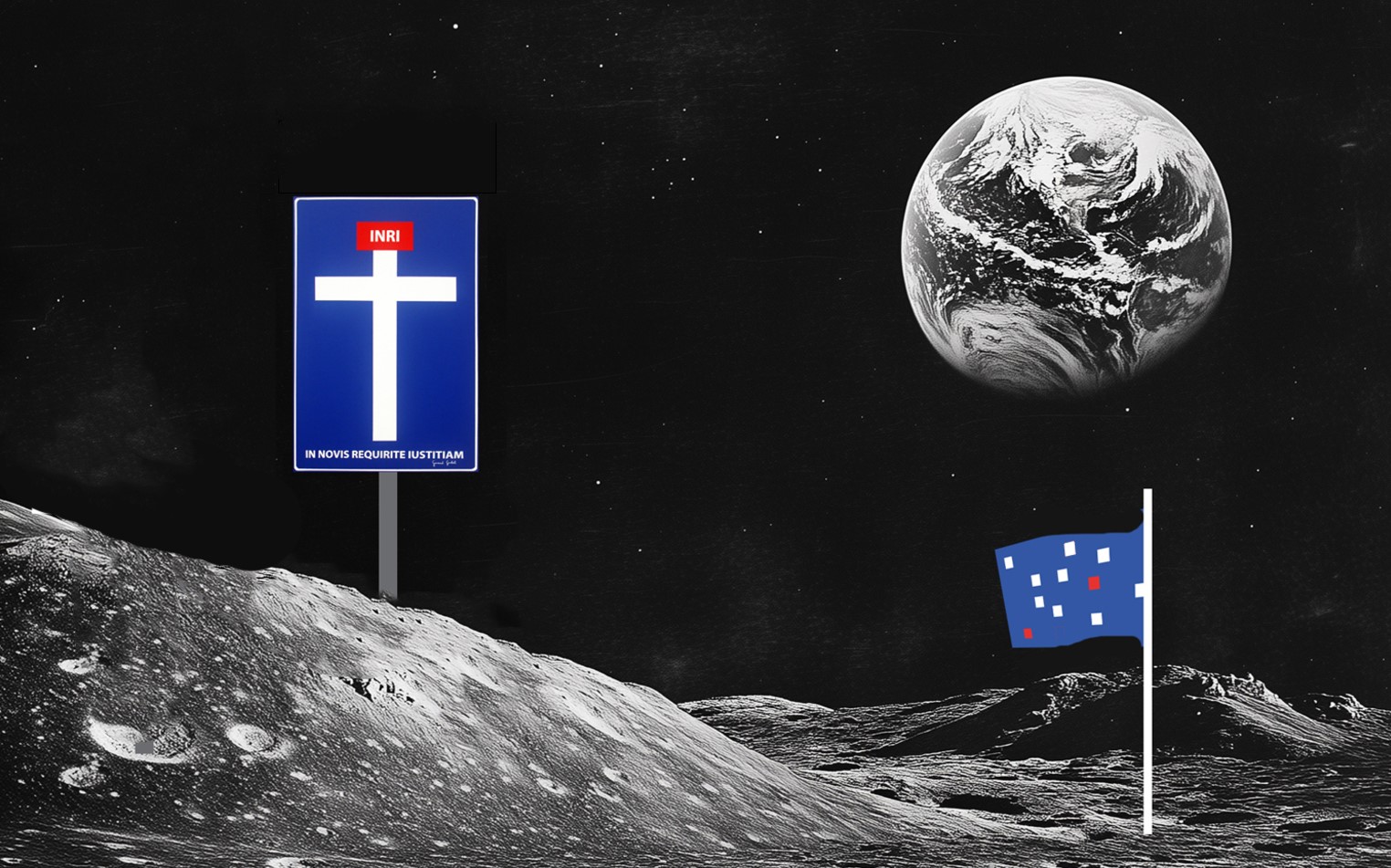 Gerard Godal plaatst een Latijns kruis op de maan, dat de vorm heeft